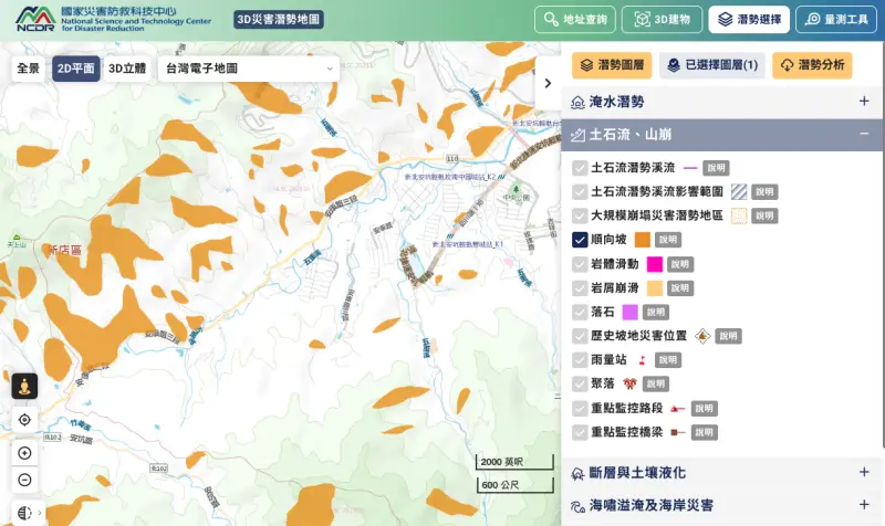 ▲3D災害潛勢地圖也能查到順向坡、土石流潛在區域等資訊。(圖/翻攝自3D災害潛勢地圖)