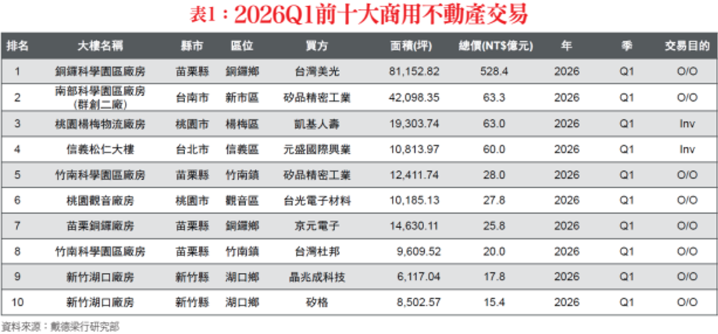而高力國際發布最新「2026年第一季商用不動產及土地投資市場調查」顯示,在美光半導體以近530億元收購力積電苗栗銅鑼廠房的帶動下,2026年第一季全台商用不動產交易金額達993億元,不僅年增幅高達120%,更一舉超越2018年全年交易額的810億元,創下高力國際追蹤以來的單季新高紀錄。