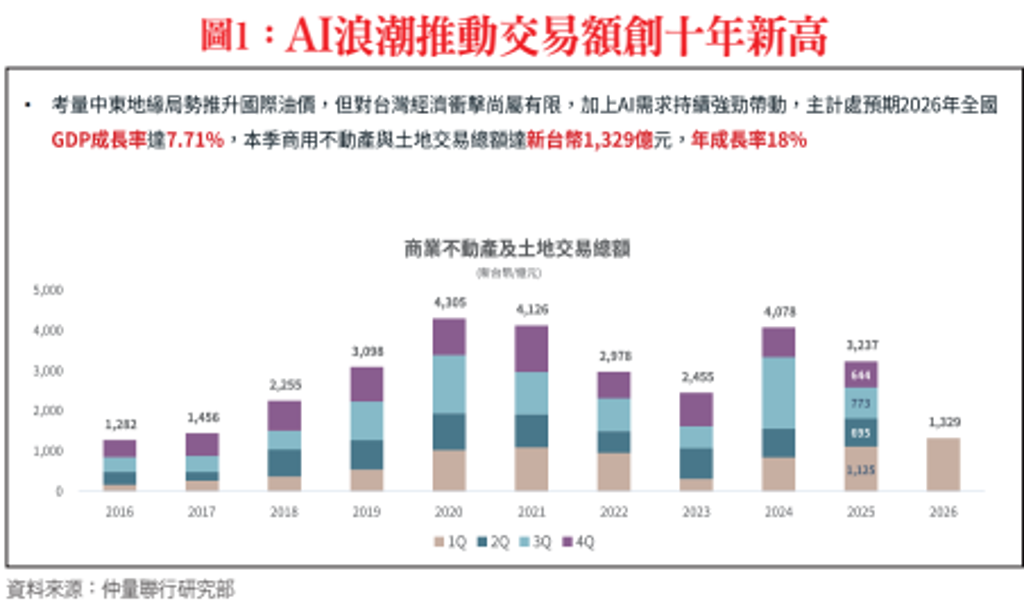 第一太平戴維斯資深協理丁玟甄也表示,台灣出口表現持續亮眼,主計處預測2026年經濟成長率可望達7.71%,經濟發展強勁,科技業擴廠動能續旺。根據第一太平戴維斯統計,第一季大型商用不動產成交金額(單筆3億元以上)達967億元,年增75%,創下單季交易最大規模。