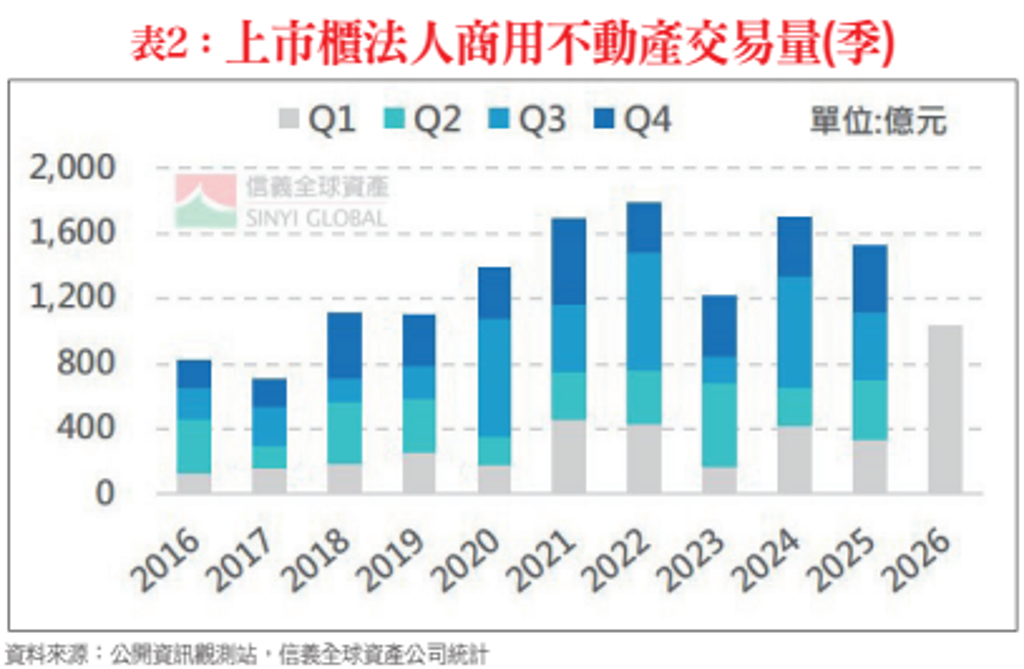 此外,根據信義全球資產公司統計,第一季上市櫃法人商用不動產交易額為1,033億元,較去年同期大幅成長210%,不僅寫下歷年單季新高,更是有統計以來季交易量首度站上千億元水位(表二)。