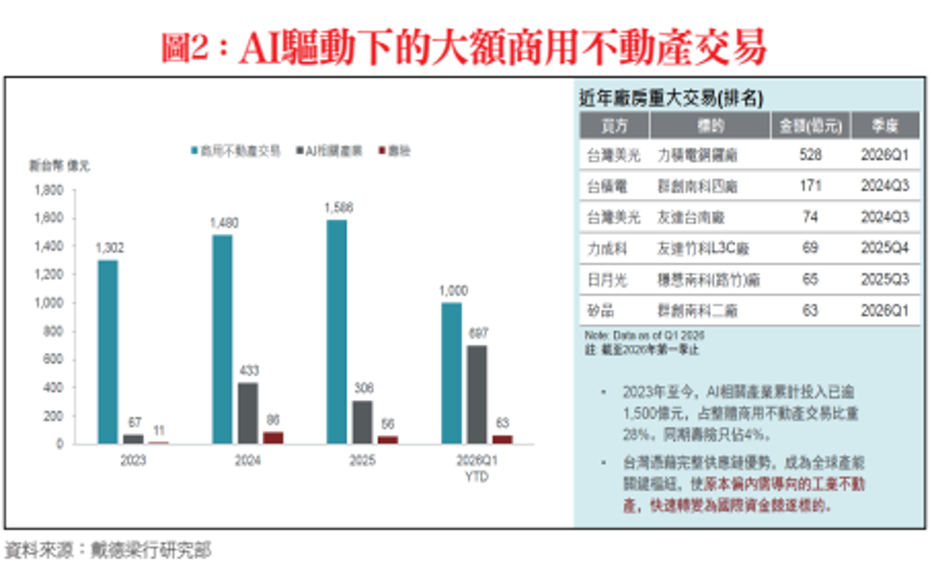 統計顯示,自2023年AI產業蓬勃發展以來,相關企業累計投入購置廠房已逾1,500億元,占整體商用不動產交易比重約28%。相較之下,傳統投資型買盤動能明顯退居次位,市場結構由資金配置轉向產業驅動(圖二)。