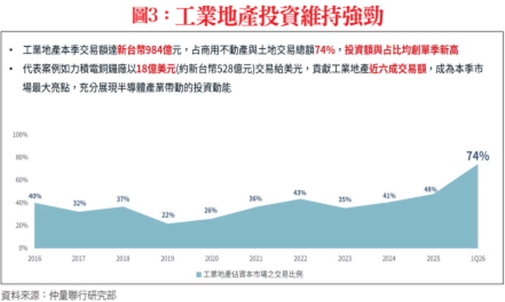 侯文信也指出,工業不動產表現尤為亮眼,本季交易金額達新台幣984億元,占整體交易總額約74%,無論交易規模或占比皆創下單季。