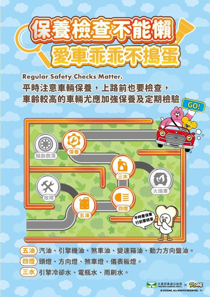高公局呼籲,用路人平時即應確實做好車輛保養,連假長途行車前,更應加強檢查五油(燃油、機油、動力方向盤油、煞車油、變速箱油)、三水(引擎冷卻水、電瓶水、雨刷水),以及輪胎胎紋、胎壓與外觀是否正常;同時留意儀表板警示燈是否亮起,並注意引擎運轉是否出現異音(可能為機件或皮帶異常),以確保行車安全。